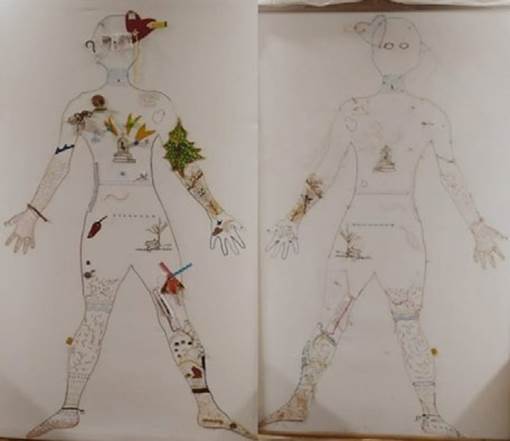 La figura 4 muestra las acciones performáticas de uno de los maestros que asistió al taller en la IE Benedikta (2021): luego de rasgar su piel tela y entrar en su cuerpo laberinto, el maestro encontró la afección en su cadera, después la materializó, la volvió afectura; en la figura se lee lo que tenían para decir la afección/afectura y que luego en la aficción nombró como tú en mi cadera (según la información entregada por el maestro). La aficción se dejó leer en voz alta, mientras tanto la CostUROmaestra hizo un ovillo con las fuerzas, conexiones, las impresiones de los otros maestros, los trazos no visibles, triangulares, afectivos y observados que luego se escricosieron en una aficción que reclamó en la CostUROmaestra la posibilidad de encontrarse para “de esta forma, encontrar a los otros” (Blanco, 2018, p. 55). La cartografía bosquejó otros pliegues ya no dentro del cuerpo laberinto sino desde las aficciones escritas por los maestros y por la CostUROmaestra; otras líneas se puntearon entre las afecturas y las aficciones creadas.