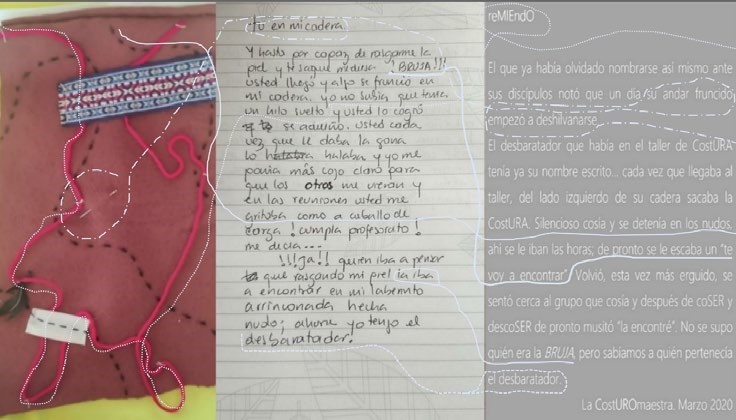 El taller de CostURA se hizo taller conforme se cosía el método: el gesto, el trazo en nuestras manos y con ellos los modos de ser leídos y de ser escritos, en tanto que la escritura académica no encajaba desde el inicio en este ejercicio de investigación doctoral, en cuanto estructura, en cuanto tipología, pues la misma no contempla “ir hacia las entrañas” (Jiménez, 2009, p. 54), y la estudiante escribía/escribe desde las entrañas; se deja seducir por la escritura reconocida hoy como farragosa, con entramados introspectivos por el misterio y el silencio.