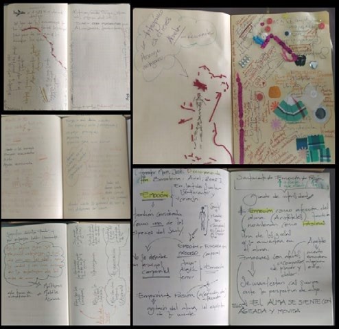 La CostURA y la esCritURA, de manera indefectible, bosquejaron desde el principio un modo de investigar diferente, pues el método se fue consolidando en el proceso; en el antes, durante y después de la creación del taller. Por ejemplo, los cuadernos de notas de la investigadora (figura 5) se convirtieron en punto de partida para confeccionar el método, en tanto que advirtió de modo no consciente, en principio, los tránsitos por la cartografía, la corpografía y costurografía. Los dibujos, la escritura discontinua, coser en los cuadernos, cortar, pegar, trazos disimiles (Brizuela, 2016) para ir en busca de la afección; pistas pespunteadas como fuga, gesto, costura, aguja, tela, hilo, urdimbre acciones que le hablaron al oído a la investigación y a este articulo: ir tras las afecciones es hacerse cargo de las zonas de la vida como lo nombró María Zambrano, es ir tras un saber sí –del que hablara Fernando Bárcena– y que se hizo borroso en el encuentro educativo, es ser amigo de sí mismo tal y como lo escribió Michel Foucault en su obra Hermenéutica del sujeto, es responder al júbilo que halló el cuerpo laberinto cuando su piel tela se pudo rasgar para ir al encuentro de una afección que al ser hallada comenzó a respirar y a vivir de otra manera (Zambrano, 2019). Así, la escucha atenta nos llevó a descoSER y recoSER la figura del cartógrafo por cuanto tiene su propio trayecto y realiza análisis acorde a la asistencia al taller (Martínez, 2019). Para el caso de este estudio, el trayecto de la investigadora se fue delineando por los tránsitos señalados por los maestros: unas veces lineales, otros curvos, otros sin salida, otros forzosos, otros intensos,
