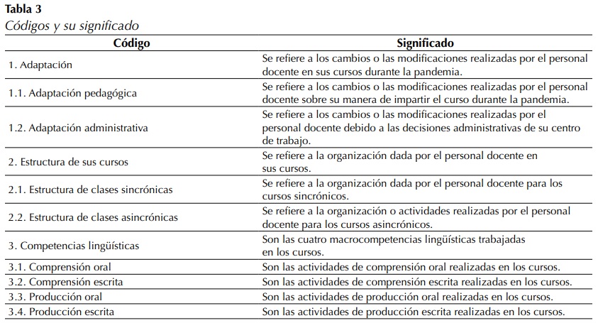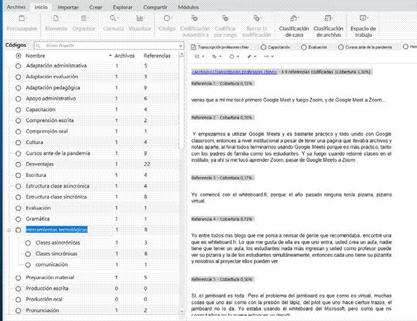 La codificación estuvo a cargo de tres de las personas investigadoras. Luego, se hizo otra con el programa de NVIVO, para esta, se tuvieron en cuenta las categorías y subcategorías ya establecidas con una codificación axial. De esta manera, se codificaron de nuevo los datos con las categorías y las subcategorías establecidas, por ejemplo: la categoría “herramientas tecnológicas” se dividió en varias subcategorías (comunicación, clases sincrónicas y clases asincrónicas); “adaptación” se clasificó también en subcategorías (pedagógica y administrativa); “estructura de los cursos” (sincrónico y asincrónico); “competencias lingüísticas” (comprensión oral, comprensión escrita, producción oral y producción escrita); “componentes de la lengua” (gramática, vocabulario, pronunciación, cultura, caligrafía); “ventajas”; “desventajas”, etc. En este artículo, se presentaron solamente los resultados relacionados con la adaptación metodológica en las competencias lingüísticas y las herramientas tecnológicas. En la figura 1, se muestra un ejemplo de la codificación con el programa NVIVO.