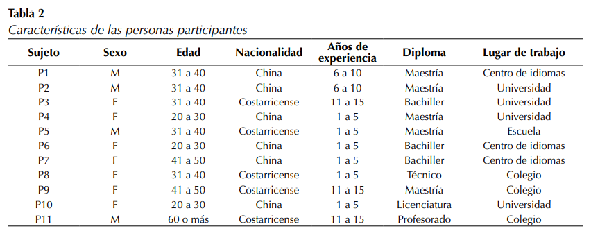 La investigación se llevó a cabo en Costa Rica durante 2021. Las personas participantes fueron docentes de chino mandarín como lengua extranjera y se empleó un muestreo no probabilístico intencional, con el fin de obtener sujetos que cumplieran con los criterios de inclusión establecidos previamente en la investigación. Estos fueron: docentes de chino mandarín, haber impartido cursos de chino durante 2020 y trabajar en centros de idiomas, escuelas, colegios o universidades. De esta manera, los individuos que participaron en la investigación se caracterizan en la tabla 2.