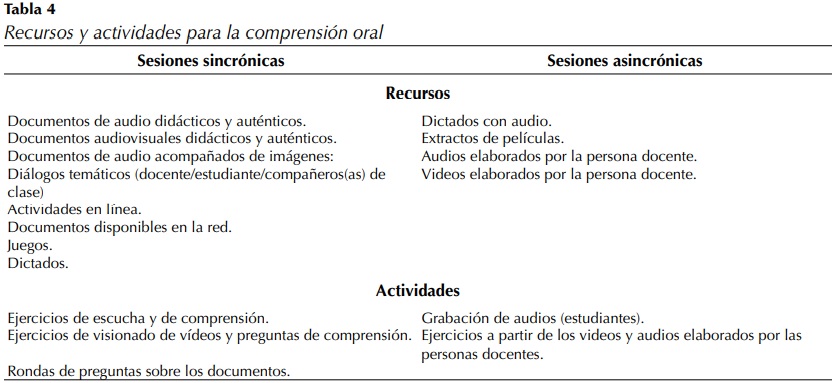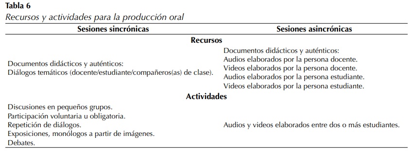 En el caso de la producción oral, los recursos y las actividades que trabaja el personal docente se describen en la tabla 6.