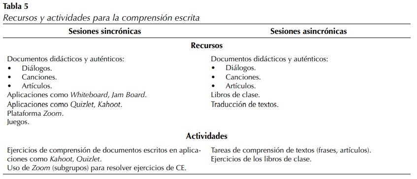 En el caso de la comprensión escrita, los recursos y las actividades que realiza el personal docente se describen en la tabla 5.