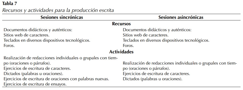 En el caso de la producción escrita, los recursos y las actividades que realiza el personal docente se describen en la tabla 7.