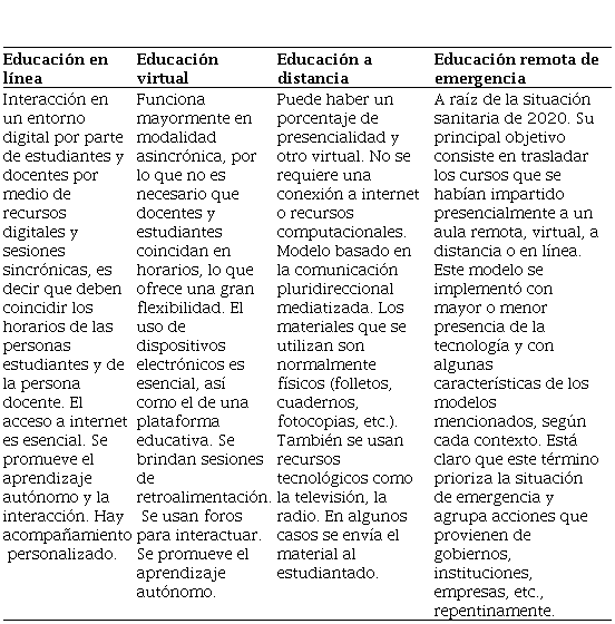 Es necesario recordar que, antes de la pandemia, los cursos a distancia y también el aprendizaje en línea obedecían a una elección y no a una imposición. A raíz de la situación de emergencia, en cada país, las autoridades gubernamentales y educativas propusieron una serie de reformas para poder guiar al profesorado y al estudiantado. En consecuencia, es necesario tener claridad en cuanto a las distintas modalidades de enseñanza, ya que se han implementado en diversos contextos y niveles educativos, como lo muestra en la tabla 1.