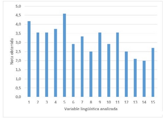En la figura 1, se pueden observar los promedios obtenidos en las valoraciones realizadas con las rúbricas de los doce cuestionarios, discriminados por variable. Vale la pena resaltar que dos de las variables textuales (puntuación y marcadores discursivos) obtuvieron un promedio por debajo de 3,0/5,0. De igual forma, cuatro de las variables de retórica y argumentación (planteamiento de la tesis, uso de textos y documentos como garantes, uso de la posición de otros autores en la argumentación y elusión de falacias argumentativas) también tuvieron promedios inferiores a 3,0.