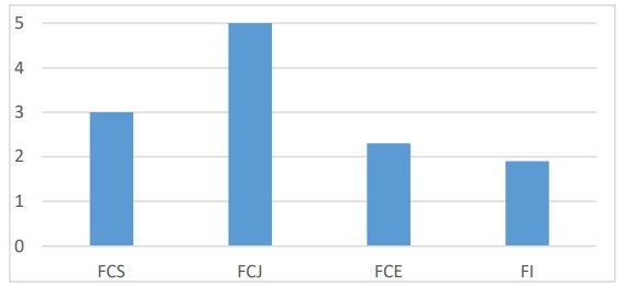 En relación con los participantes y su formación disciplinaria, se encontró una diferencia significativa en la calidad textual, retórica y argumentativa. En la figura 2, se observa cómo cuestionarios elaborados por los estudiantes de la Facultad de Ciencias Jurídicas y Políticas (FCJ) cumplieron a cabalidad con los aspectos demandados en la rúbrica, con una nota de 5,0/5,0. Los participantes de la Facultad de Ciencias Sociales (FCS) obtuvieron una nota promedio aprobatoria de 3,0. No obstante, los de los participantes de la Facultad de Ciencias Empresariales (FCE) y la Facultad de Ingeniería no alcanzaron el punto aprobatorio, con puntajes de 2,3 y 1,9, respectivamente.