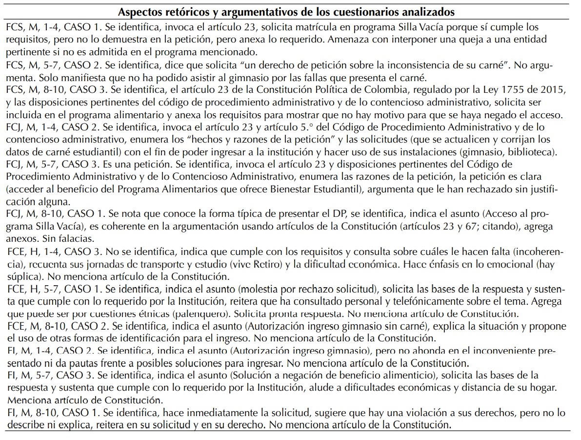 Categorías emergentes de las habilidades retóricas y argumentativas en derechos de petición