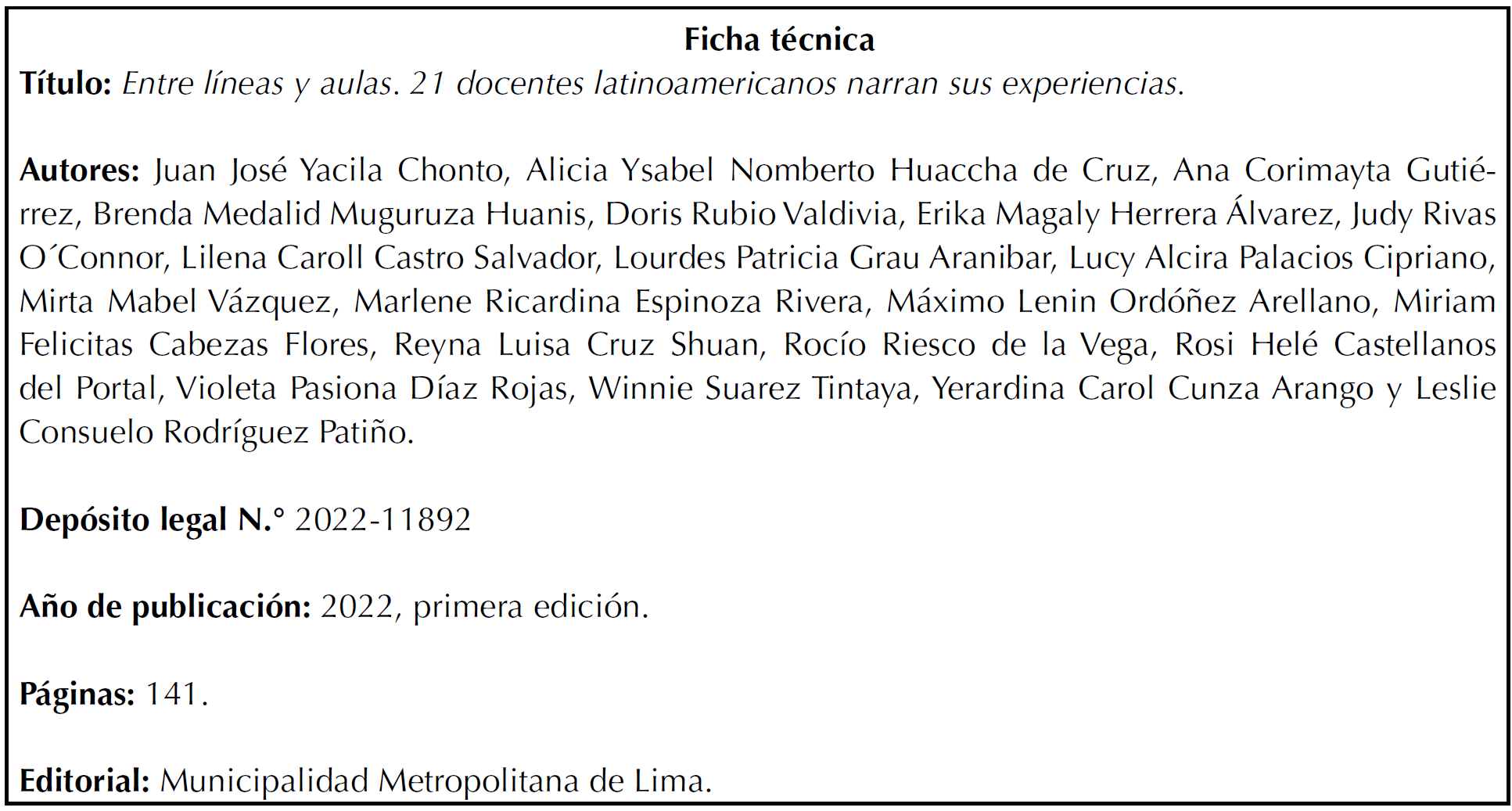 Yacila, J., Nomberto, A., Corimayta, A., Muguruza, B., Rubio, D., Herrera, E., Rivas, J., Castro, L., Grau, L., Palacios, L., Vázquez, M., Espinoza, M., Ordóñez, L., Cabezas, M., Cruz, L., Riesco, R., Castellanos, R., Díaz, V., Suarez, W., Cunza, C. y Rodríguez, C. (2022). Entre líneas y aulas. 21 docentes latinoamericanos narran sus experiencias. (1.. Ed.). Municipalidad Metropolitana de Lima.