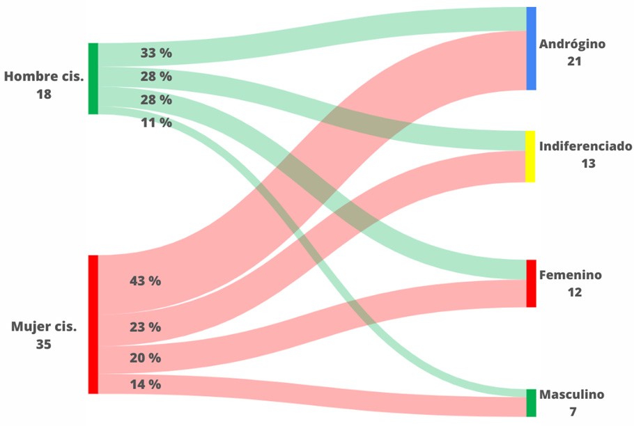Como se muestra en la figura 1, aunque la forma en la que se identifican los y las participantes tiende a la binariedad de género (18 participantes se identificaron como hombres y 35 como mujeres cisgénero; mientras que solo 1, como persona no binaria), al observar los resultados del BSRI se nota que la tendencia se dirige hacia la androginia (21 participantes) y la indiferenciación (13 participantes). Estos resultados indican que la mayoría de los y las participantes adoptan roles de género que no se ajustan estrictamente a una de las categorías masculino o femenino, apuntando a que, en la mayoría de los casos, la identidad de género de una persona no se alinea completamente con los roles de género tradicionales que definen su personalidad.