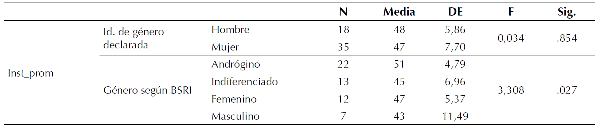Como se presenta en la tabla 1, por un lado, los hombres cisgénero tienen una media ligeramente más alta y una desviación estándar más baja que las mujeres, diferencia que no es estadísticamente significativa (esto coincide con los resultados de Alghamdi et al., 2023; y de Ghazvini y Khajehpoura, 2011). Por otro lado, la categoría andrógino presenta una media cuatro puntos superior a la siguiente categoría, femenino. Esto sugiere que tanto las personas andróginas como las femeninas exhiben una motivación instrumental de promoción más elevada en comparación con las personas indiferenciadas o masculinas, diferencia que sí es estadísticamente significativa (p = 0,027).