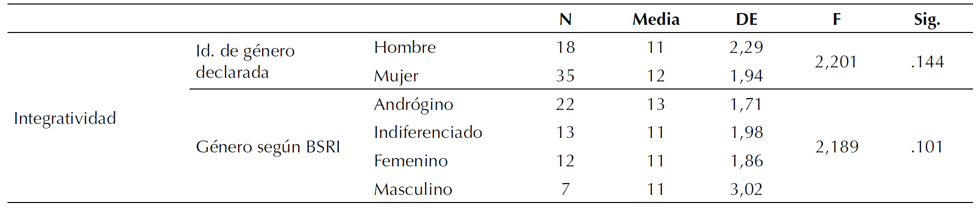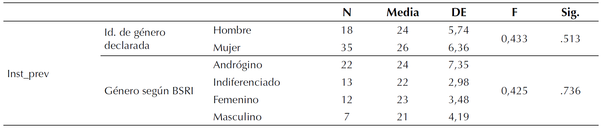 A diferencia de los resultados anteriores, pese a que ambos géneros binarios muestran una baja motivación instrumental de prevención, para esta variable se observa en la tabla 2 una diferencia que no alcanza significancia estadística: las mujeres presentan una media ligeramente más alta, aunque su desviación estándar también es mayor que la de los hombres. Del mismo modo, a pesar de que las cuatro categorías propuestas por el BSRI exhiben una baja motivación instrumental de prevención, las personas andróginas muestran un promedio ligeramente superior en comparación con las personas femeninas, indiferenciadas y masculinas. Nuevamente, esta diferencia carece de significancia estadística.