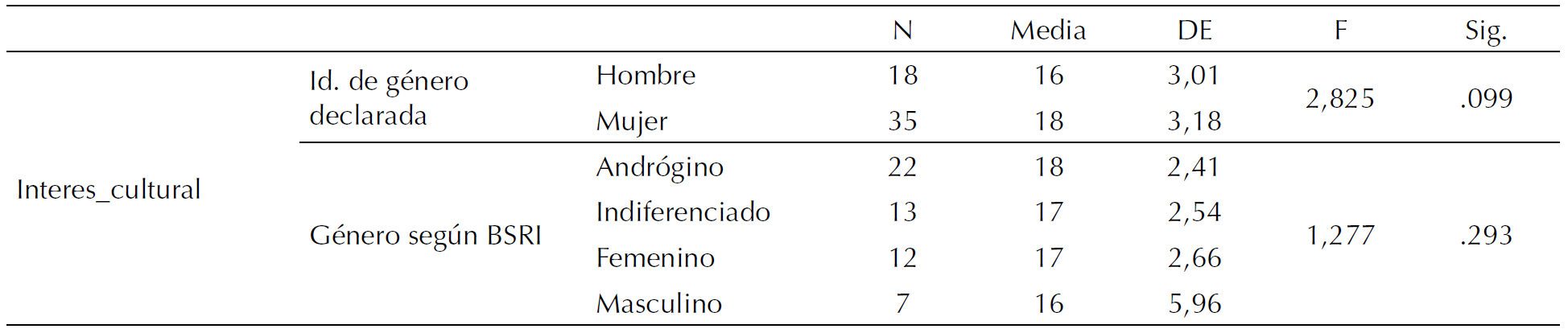 En relación con el interés cultural, como se muestra en la tabla 3, las mujeres exhiben un promedio y una desviación estándar superiores a los hombres, aunque esta diferencia no alcanza significancia estadística. En esta categoría, la distinción binaria se alinea con la clasificación del BSRI, que muestra una menor desviación estándar, ya que tanto los hombres como las personas con características masculinas presentan la media más baja de interés cultural. Estos resultados coinciden con las conclusiones de Ghazvini y Khajehpoura (2011), quienes señalan que las mujeres muestran una mayor motivación integrativa, lo que implica un mayor interés cultural.