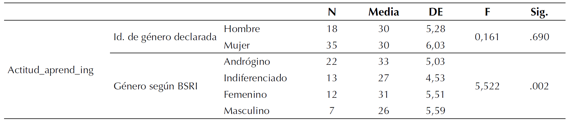 De acuerdo con los datos en la tabla 5, aunque en lo que respecta a las categorías del BSRI, la categoría andrógina se sitúa por encima de las demás, manteniendo la tendencia que se ha observado en todas las categorías de la motivación; se observa también que las mujeres muestran una actitud más favorable hacia la comunidad de habla inglesa en comparación con los hombres. Esta es la única categoría que, desde una perspectiva binaria, revela una diferencia estadísticamente significativa (p = 0,022). En esta categoría se encuentran aspectos que se refieren al deseo de viajar, conocer personas y saber más sobre la comunidad que habla la lengua meta, es decir que existe un deseo de integrarse con esa comunidad, por tanto, se podría decir que este resultado concuerda con Ghazvini y Khajehpoura (2011).