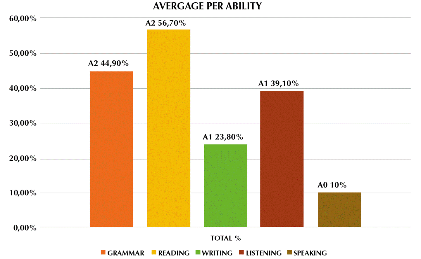 Students averaged at A1 across all skills, with production skills being the most challenging. This indicates that they lack the necessary vocabulary and grammar for effective expression. Many test responses were left blank, especially in writing, as the students were instructed to skip the questions they felt unsure about. Finally, we noticed that, in class, it is more common to perform activities related to receptive skills than those involving speaking or writing. The teacher usually brought listening activities, such as playing audios from the textbook.