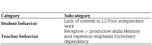 Dictionary dependency. The last subcategory that we identified as related to teacher behavior was a dependence on the dictionary during class. This was evident in the observations: for a good portion of each class, the students used the dictionary as the main resource to answer the tasks assigned by the teacher.