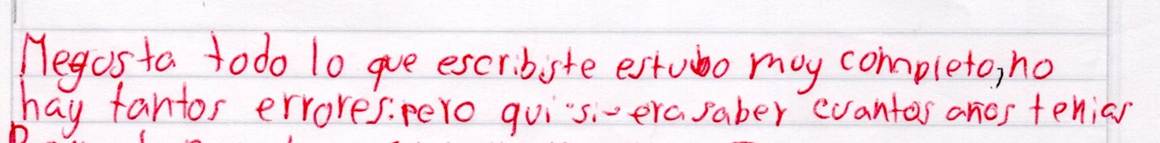 A mí me gustaron mucho los talleres de escritura, porque la experiencia de ver cómo mis amigos me corregían una tilde, un punto, una mayúscula... cuando iba a hacer la reescritura me acordaba de estos detalles, incluso cuando estaba en otra materia lo ponía en práctica y mi letra mejoraba sin parar. (EE3P1)