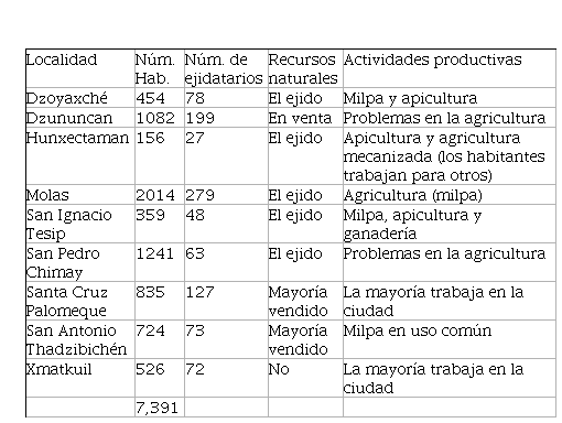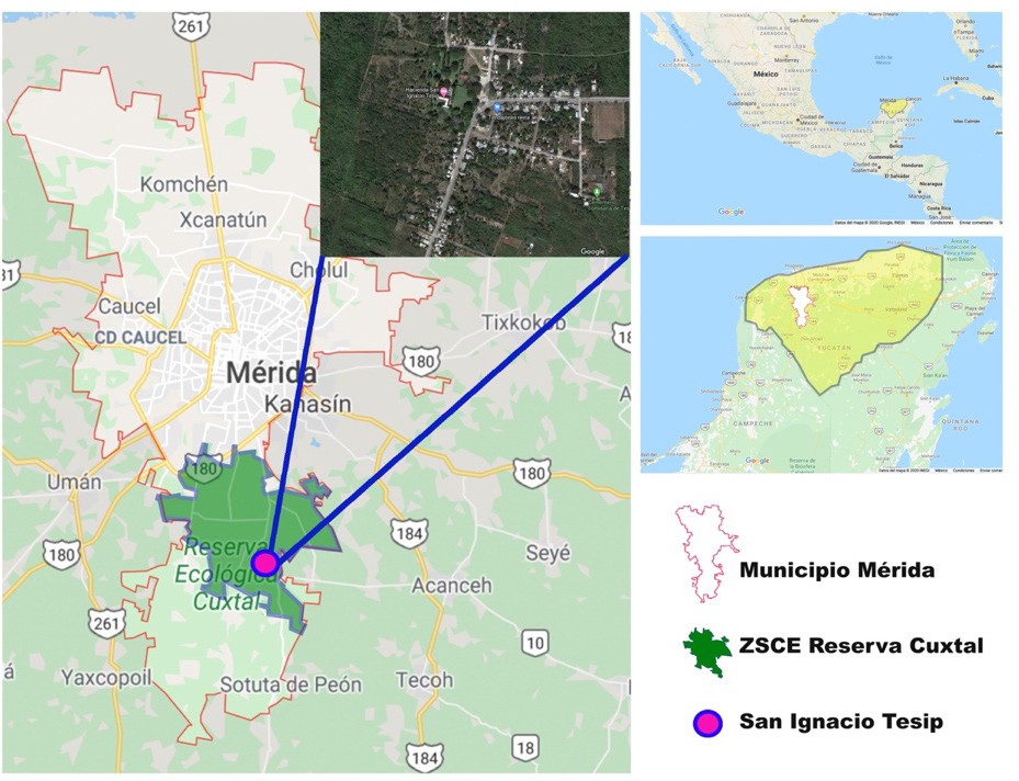 La ZSCE Reserva Cuxtal se ubica al sur del municipio de Mérida con una superficie de 10,757 hectáreas (GMAM, 2018). Dicha ANP está formada por dos comisarías: Dzununcán y Molas; y siete sub-comisarías: Santa Cruz Palomeque, Tahdzibichén, X’matkuil, San Pedro Chimay, San Ignacio Tesip, Hunxectaman, Dzoyaxché, con 7,391 habitantes (INEGI, 2010), y una zona conurbada entorno al periférico, con 10 colonias de la ciudad de Mérida que pertenecen a la comisa- ría de Dzununcán, X’Matkuil y los tablajes de San Antonio Xluch y Kanasín. El presente estudio abordó las comisarías consideradas como comunidades mayas, ya que su forma de organización es tanto municipal como ejidal y se registran ac- tividades como la milpa, que aún realizan algunas familias; sin embargo, varios de estos ejidos han sido vendidos (Cuadro 1).