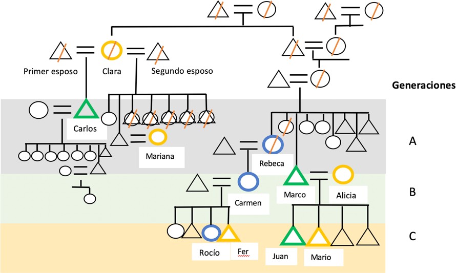 Las personas entrevistadas se organizaron en tres generaciones: la gene- ración A, con Rebeca de 67 años (1952 - 2020) y Carlos (tío de Rebeca y Marco) de 80 años (1937-2021); la generación B con Carmen de 42 años (1977), hija de Carmen, y Marco de 60 años (1959); la generación C, Rocío de 19 años (2000) hija de Carmen y nieta de Rebeca, y por su parte Juan de 19 años (2000) hijo de Marco (Figura 2).