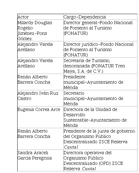 Nota. Lista de firmantes del Convenido del proyecto Tren Maya del Fonatur con el Ayuntamien- to de Mérida y el OPD ZSCE Reserva Cuxtal. Elaboración propia durante el trabajo de campo 2018-2020. Fuente: Convenio de colaboración entre el Ayuntamiento de Mérida, el OPD Reserva Cuxtal y el Fondo Nacional de Fomento al Turismo (FONATUR) (Instituto Nacional de Transpa- rencia Acceso a la Información y Protección de Datos Personales [INAI], 2020).
