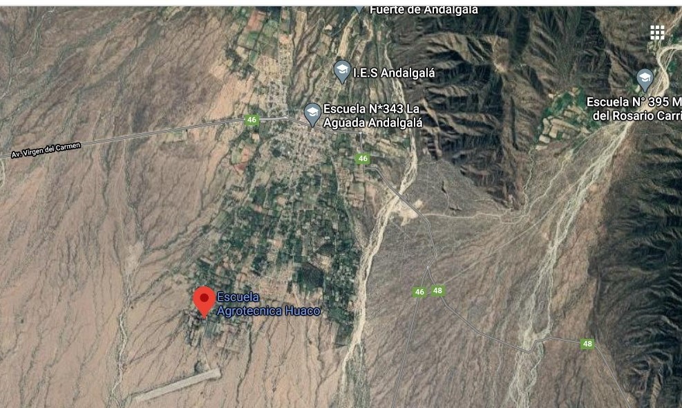 Localización de la escuela. Fuente: https://www.google.com/maps/place/Escuela+Agro-tecnica+Huaco/@-27.6163893,-66.3627261,12211m/data=!3m1!1e3!4m5!3m4!1s0x0:0x-85933b7686566afc!8m2!3d-27.6163893!4d-66.3364619
