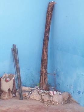 En dicha casa mi padre me presentó al k’ojonché, estaba asentado en un rincón. El k’ojonché’ es un madero que los antiguos sepultureros utilizaban para apisonar la tierra de las sepulturas después de haber depositado el ataúd en la tumba. Según me explicaba mi papá, el madero había sido mandado labrar y do- nado después a la comunidad, preocupada por poner fin a la desagradable acción de los perros.