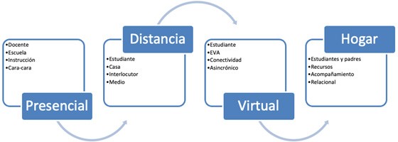 A partir de marzo de 2020 se vivió un cambio abrupto en el sistema educativo y para todos los estudiantes. Pinto (2020) lo representa en la Figura 1. El autor men- ciona que la pandemia generó una traslación de las modalidades. Pasar desde la modalidad presencial a una a distancia e incluso hasta una educación en el hogar.