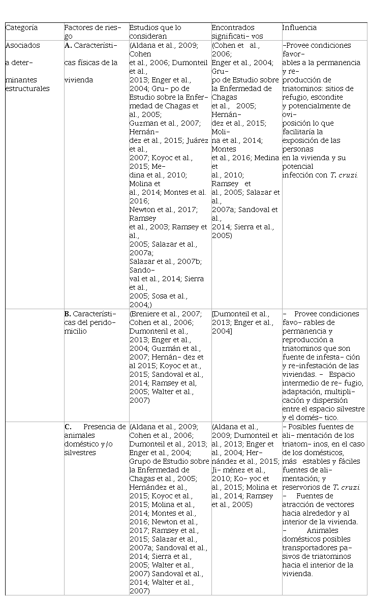En la mayoría de los estudios sobre factores de riesgo, las características físi- cas de las viviendas de la población, principalmente rurales, fueron consideradas como variables de riesgo (22/25) y en la mitad resultaron significativos (Tabla 1A). Las condiciones y mantenimiento físico de la vivienda pueden favorecer -o no- la presencia del vector, y es también un indicador del nivel socioeconómico de los hogares, dada la asociación del Chagas con la pobreza (Dias, 2007). En el diseño de investigación epidemiológica, las condiciones materiales de vida de las personas, junto con variables como la falta de servicios básicos (Juárez et al., 2009), la ubicación de la vivienda en un área periurbana (asociado al nivel socioeconómico) (Ramsey et al., 2005), la pertenencia a programas de bienestar social (Sosa et al., 2004) se identificaron como factores intermedios del riesgo a nivel comunidad, determinados por aspectos socioeconómicos estructurales, siendo el ingreso uno de los más importantes (Fernández et al., 2019; Haro & Martínez, 2015).