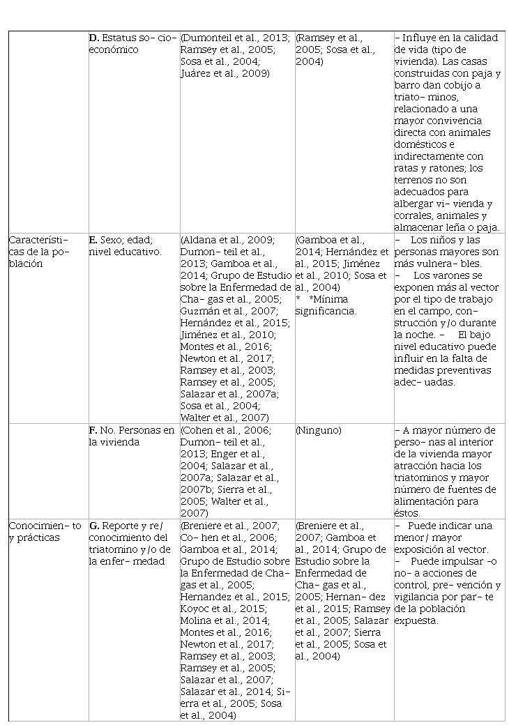 Sobre la edad, el bajo el nivel educativo y el género fue encontrado con significancia baja en algunos estudios y apuntan a que los infantes y las personas mayores son más vulnerables, al asociarlos con la falta de medidas preventivas (Gamboa et al. 2014; Grupo de Estudio sobre la Enfermedad de Chagas et al., 2005; Jiménez et al. 2010). También se sugirió que, por su trabajo, el grupo de varones se expone más al vector, en particular los trabajadores de la construcción y campesinos (Hernández et al., 2015; Jiménez et al. 2010).