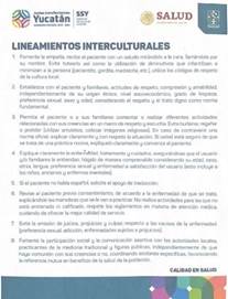 En el anterior gobierno la aval ciudadana fungía como traductora del maya al español, auxiliar de salud e intermediaria con la población, y recibía un sueldo del gobierno. Había en marcha un esquema del Programa de Salud Inter- cultural, dentro del Plan Nacional de Desarrollo (2013-2018), en el que participó la Dra. López con capacitaciones y encuentros, pero fue suspendido en el 2018, con el cambio de gobierno (Dra. López Reyes, com. pers., agosto 19 de 2021). Los lineamientos interculturales siguen siendo parte del esquema de atención, y son mostrados al público en la pizarra de la clínica con el sello de los gobier- nos estatal y federal. Señalan a grandes rasgos la necesidad de proporcionar al paciente una atención respetuosa, clara, comprensiva y objetiva, y fomentan la participación social de los terapeutas mayas en la solución de las enfermedades de los pobladores (Imagen 1). La Dra. Martha Contreras, directora del Centro de Salud de Xocén, y la Dra. Guadalupe López, la anterior, señalan que el personal del centro de salud ha hecho un gran esfuerzo para escuchar y comprender las perspectivas y sentir de los pacientes mayas en torno a la salud y la enfermedad. Sin embargo, tienen muchas limitaciones para lograrlo debido al escaso personal destinado, la atención es dirigida únicamente al primer nivel con la lejanía de los especialistas, carentes de sensibilidad y preparación intercultural, y el abundante papeleo oficial solicitado les resta tiempo para el paciente y genera horas de es- pera para brindarles el servicio. A lo anterior se suma la falta de equipo para un adecuado diagnóstico y gasolina para la ambulancia, entre otras cosas que gene- ran descontento en los usuarios.