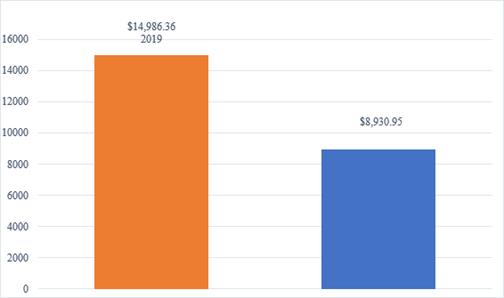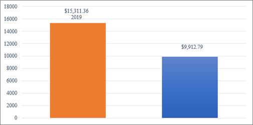 Antes de la pandemia, el promedio mensual de todos los entrevistados en 2019 era de $15,311 pesos, con el confinamiento se redujo a $9,912, el equiva- lente al 64% (Figura 1).