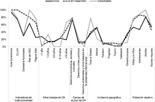 Para construir el perfil general de las OSC de derechos humanos de Yucatán, se tomaron en cuenta los grupos identificados en el marco metodológico, caracteri- zados según la etapa en la que se encuentra su capacidad de respuesta y de soste- nibilidad, como grupo inicial, grupo en desarrollo y grupo consolidado.