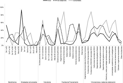 En la Figura 2 se presenta el conjunto de variables que se refieren a las caracte- rísticas de operación y sostenibilidad de las OSC. Se observa en esta gráfica que el grupo inicial tiende a tener una menor incidencia en las variables presentadas, destacando que es el grupo con menor número de beneficiarios atendidos anual- mente, menor cantidad de empleados remunerados y aportaciones de asociados como su principal fuente de financiamiento. El grupo en desarrollo se caracteriza por contar entre sus principales fuentes de financiamiento con una mayor can- tidad de donativos de particulares y es también el grupo con la mayor cantidad de OSC que suelen solicitar apoyos del gobierno estatal y municipal. El grupo consolidado presenta una mayor frecuencia en las variables examinadas, entre las que destaca su financiamiento a través de organismos internacionales y su vinculación con fundaciones y ONG nacionales e internacionales, así como con colectivos y redes que trabajan temáticas específicas y con otras OSC locales de derechos humanos.