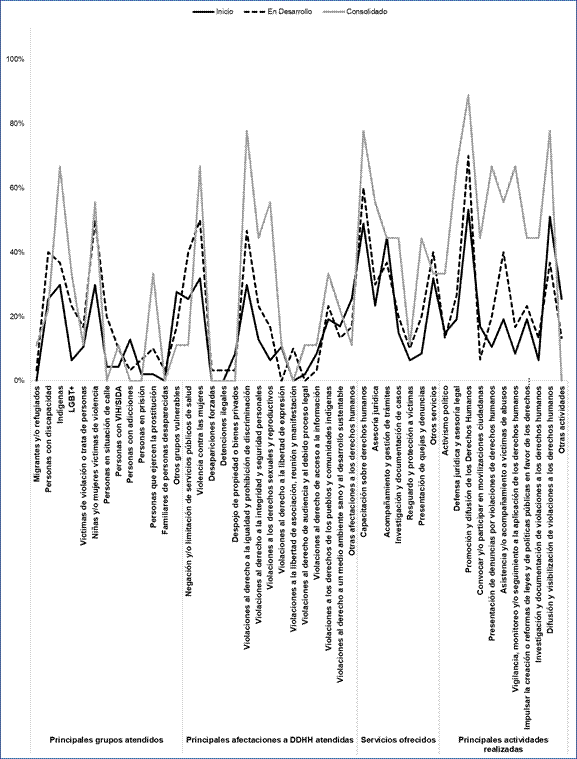 En el grupo de OSC consolidadas se destaca una mayor tendencia a tra- bajar con poblaciones indígenas, personas LGBT+, niñas y mujeres víctimas de violencia, y personas que ejercen la prostitución. Las principales vulneraciones que atienden son: violencia contra las mujeres, discriminación y violaciones a los derechos sexuales y a los derechos de los pueblos y comunidades indígenas. En cuanto a los principales servicios que ofrece el grupo consolidado, tiende a ser el que ofrece una mayor proporción de capacitación sobre derechos humanos, acompañamiento y gestión de trámites, investigación y documentación de casos y la presentación de quejas y denuncias. Sus actividades son muy variadas y suelen atender prácticamente casi todas las exploradas en el estudio. Se destaca también en este grupo una mayor frecuencia en actividades de incidencia en po- líticas públicas y en investigación.