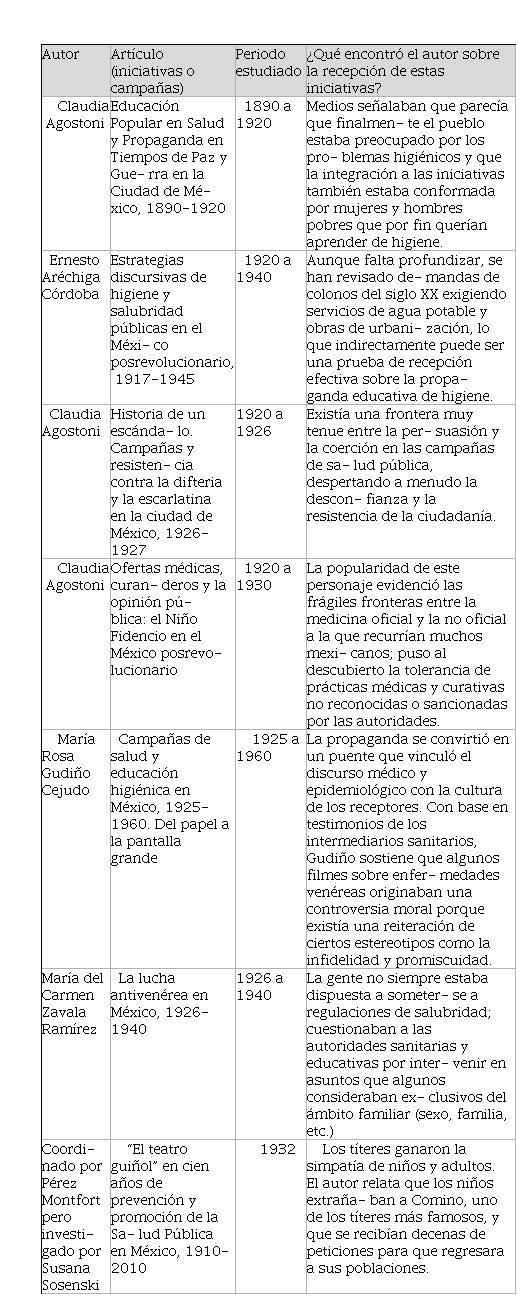 El contenido de la tabla resalta la forma en que Agostoni (2005) y Aréchi- ga (2007) ilustran la manera en que se comenzó a popularizar la educación de la salud promoviendo la higiene personal como un aspecto importante para una vida digna y saludable. Sus hallazgos muestran que, a pesar de las características de la cotidianidad mexicana de aquel entonces, las clases populares se interesa- ron por adoptar las conductas difundidas en las campañas de salubridad a través de todos los medios posibles (escritos y audiovisuales). No obstante, los conte- nidos discursivos que analizaron en sus exploraciones revelan que tuvieron que implementarse medidas drásticas con un cariz de dictadura, las cuales tuvieron poca aprobación por las instituciones.