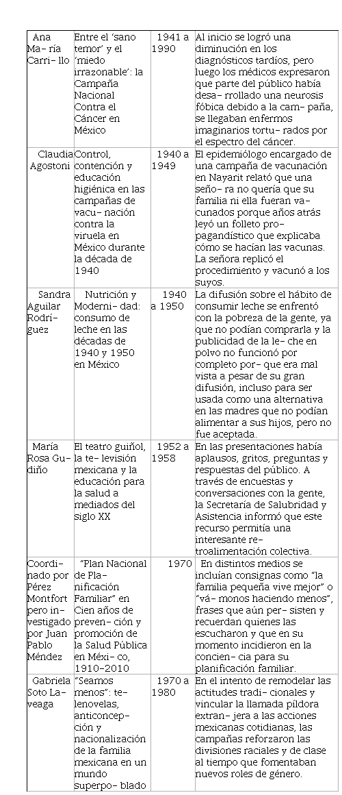 El total de los 42 estudios historiográficos sobre campañas de promoción, comu- nicación y educación para la salud, abordados de manera general, dan cuenta de los inicios de la comunicación sanitaria en México mucho antes de que se insti- tucionalizara como una disciplina, dichos estudios describen, si así se requiere, cronológicamente diversas acciones en comunicación que se llevaron a cabo para promover y educar en temas de salud en el siglo XX.