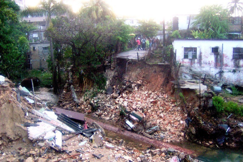 El Hueco, una de las áreas insalubres, sufrió el mayor desastre de la his- toria local como herencia de la mala planificación de los terrenos. La Compañía de Ferrocarril, había construido desde finales del Siglo XIX un sistema above- dado para el paso de una de las zanjas y encima se rellenó, para alcanzar el nivel que debía poseer el trayecto de la vía férrea, cuyo tren uniría Marianao con la Playa. Con posterioridad se construyó a mediados del siglo XX, una carretera, para lo cual se fabricó otro puente, quedando entre los dos, un hueco. A partir del hueco entre los dos citados puentes, se desató el desastre, porque ya el tren no funcionaba y sobre la antigua línea se construyeron viviendas. El microvertedero compuesto por bolsas de nylon, envases metálicos y sintéticos, afectó al obsoleto sistema de evacuación de agua. El hueco se convirtió en represa que, al saturarse, arrastró el puente – cortina, cuya presión de agua causó inundaciones que pro- vocaron la interrupción de una calle. La acción de la naturaleza se combinó con un deslizamiento de tierra, de un terreno en pendiente, lo cual convirtió un hueco en represa artificial por tupición de redes, donde el agua al buscar salida arrastró cuanta obra de “ingeniería” encontró a su paso (Rangel, 2008:64).