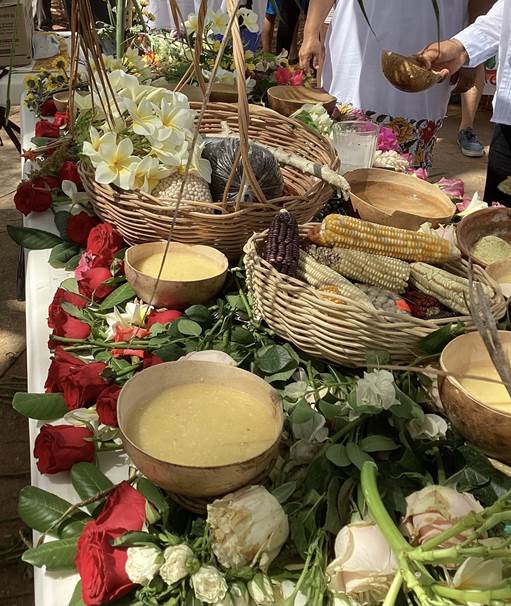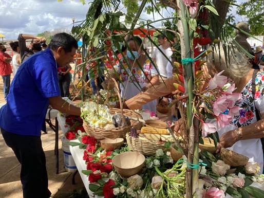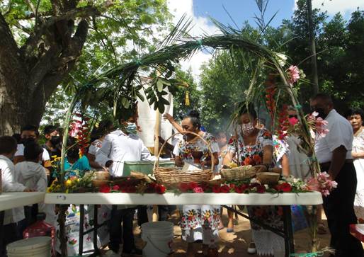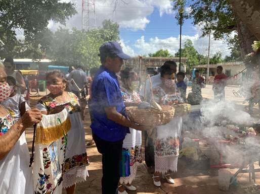 La procesión inició con la música de la charanga acompañando su camino hasta el centro del pueblo, entraron en medio de las mesas con semillas hasta el altar donde se cubrieron de incienso las canastas y sus portadores. A continuación, se colocaron en el altar y se procedió a verter saká en las jícaras para que pudiera ser ofrendado a Dios Nuestro Señor y a la Virgen María y a todos los seres sagrados dueños del monte, en agradecimiento por la Santa Gracia, como se nombra al maíz, por la cosecha y por la vida. La oración la dijo en maya uno de los Guar- dianes acompañado por el Guardían de mayor edad, oriundo de Xoy. Cuando se retiró el saká del altar, se repartió entre los asistentes y se entregaron las canastas con semillas a quienes se encargarán de organizar la siguiente feria: la comuni- dad de Sabaché, Tixmehúac.