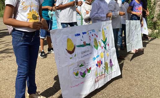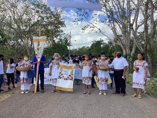 La feria aun no empezaba, poco después de las nueve de la mañana, a la en- trada del pueblo, ya estaba lista la procesión con los estandartes3 que llevaban integrantes del comité local de organización, al igual que la canasta de semillas para entregar a quienes la organizarán el próximo año. Destacaba el colorido de los hipiles bordados y la presencia de los niños mejen kaambalo’ob, pequeños aprendices con sus carteles elaborados para esta feria y proclamando también que cuidar las semillas es cuidar la vida.