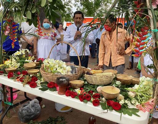 Destacaba también, la preparación minuciosa del altar con flores de los cuatro colores asociados a los puntos cardinales: blanco el norte, amarillo el sur, rojo el oriente, el lugar por donde llegan los señores del monte y de la lluvia, y morado, representando al negro, el poniente. Al igual que la colocación de 13 jícaras acos- tumbradas en estos altares, listas para verter el saká, bebida sagrada de maíz que se ofrece en agradecimiento por la cosecha2.