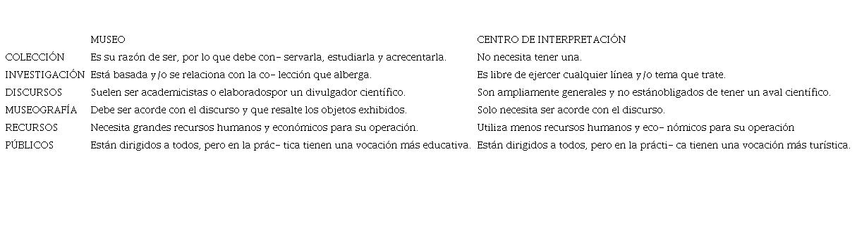 Si bien la naturaleza del museo es muy diversa, lo anterior no es más que una serie de estereo- tipos asociados con la vida que engloban los museos y los centros de interpretación patrimonial, pero que no deja de formar parte del imaginario popular de países occidentales en su mayoría. En ambos casos, suelen ser figuras del turismo masivo y tener guiones asesorados por científicos con informa- ción derivada de sus trabajos. Por tal motivo, en la práctica ambos gozan de buenas referencias sobre su labor didáctica en ambientes lúdicos y con actividades tan variadas que, desde las perspectivas anteriormente expuestas, nos sería difícil diferenciar a uno del otro si nos basamos únicamente en lo mencionado.