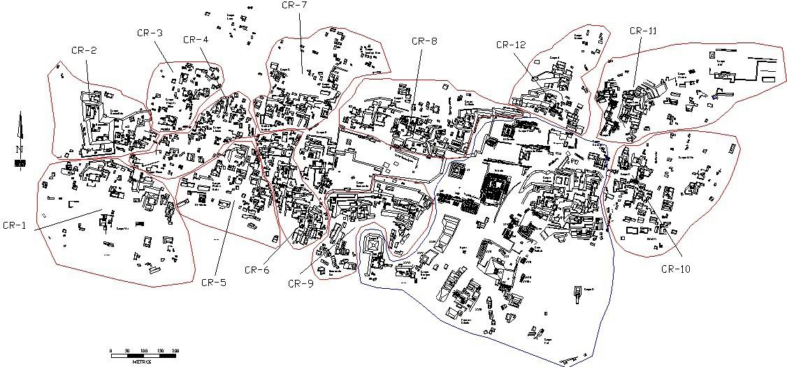 1 Por barrio o cabecera entendemos un conjunto de personas viviendo en grupos arquitectónicos habitacionales; estos espacios sociales fueron sede de grupos corporativos que compartían parentesco, nexos jerárquicos y hasta pro- bablemente áreas de actividades específicas dedicadas a la elaboración de ciertos bienes de consumo al interior de la ciudad; para la presente investigación, propongo un total de 12 barrios y un núcleo central o plaza principal.