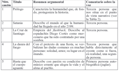 Por lo que respecta a la voz utilizada, se alternan la primera y la tercera coincidiendo no con los personajes principales u ocasionales, sino con la temática general (épica o lírica) de cada canción. En la tabla siguiente se muestra un resu- men de los temas que componen el álbum, especificando su temática y la voz.