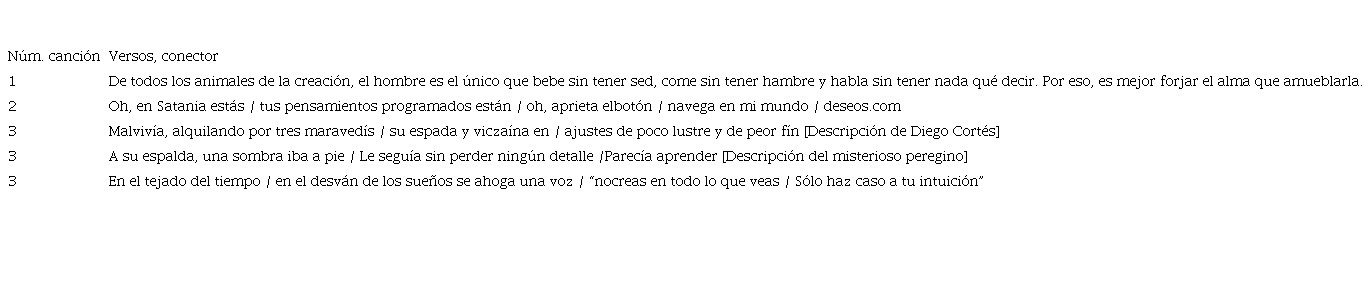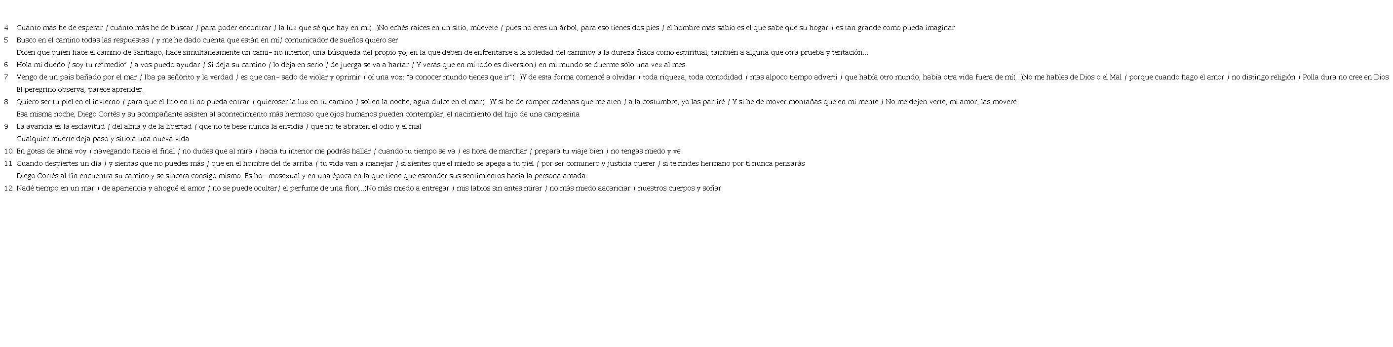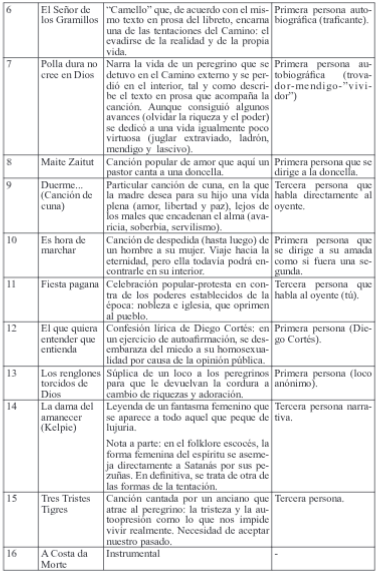 La tabla siguiente recoge, de las canciones listadas anteriormente, los versos a través de los cuales son más evidentes estos encuentros o momentos que posibilitan el crecimiento interior – como en la vida, que esto ocurra, o no, dependerá de la actitud del receptor.