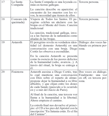 En el caso de este estudio, propondremos una interpretación posible uni- versal-particular del tema del peregrinaje como viaje como se expresa en el ál- bum Finisterra, siguiendo el tipo de análisis llevado a cabo por Cuesta y Gómez (2013). Estudiar en profundidad la experiencia que obtuvo el público implicaría un estudio a parte.