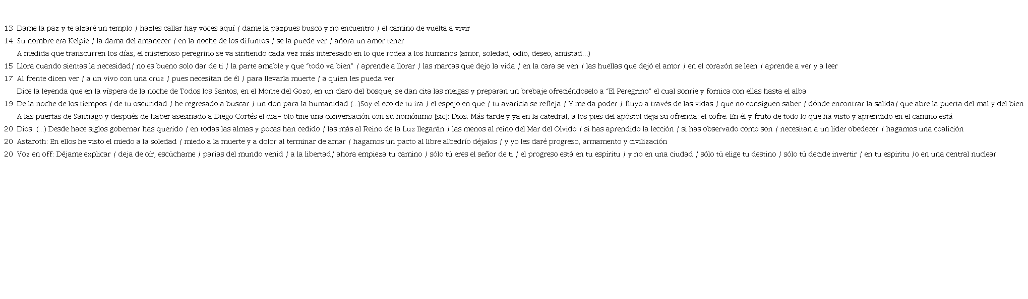 Resulta obvio que se trata de una particular experiencia de peregrinaje, no sola- mente por ser un relato (el del CD) dentro de un relato (las canciones del álbum Fi- nisterra). El pretexto narrativo es el de la búsqueda: el momento en y la razón por la cual la humanidad se abandonó, condenándose a si misma y al resto del mundo. El CD encontrado narra dos peregrinajes. Por un lado, el del diablo, Astaroth. Por otro, el de Diego Cortés, pero es también el camino de la humanidad en su conjuto.