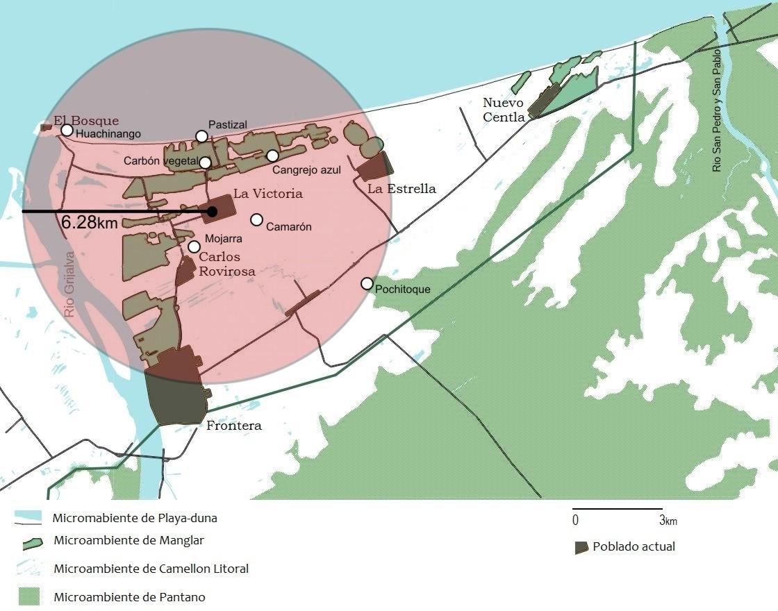 De los microambientes señalados, el de camellones litorales es el más óptimo para residencia por las condiciones de inundación a que se ven sujetas las demás zonas ecológicas. En la actualidad son siete las comunidades ubicadas en esta región costera de Tabasco, situadas entre el río Grijalva y el río San Pedro y San Pablo (Ciudad de Frontera, Poblado Carlos Rovirosa, Ejido La Estrella, Ranchería El Bosque, Ranchería La Victoria, Ejido Nuevo Centla). En su mayo- ría, estas poblaciones están asentadas en el microambiente de cordones litorales (71.4%), a excepción de la ciudad de Frontera que se ubica en un área de dunas arenosas colindante al río Grijalva, y la ranchería El Bosque que se asienta en zona de playa (Guevara, 2015).