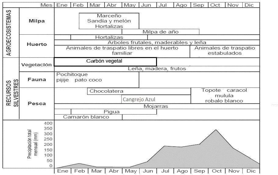 Figura 2. Ciclo de precipitación anual y calendarización del carbón vegetal en comparación con otros recursos de la zona costera de Centla (Modificado de Mamoine et al., 2006, Figura 2).