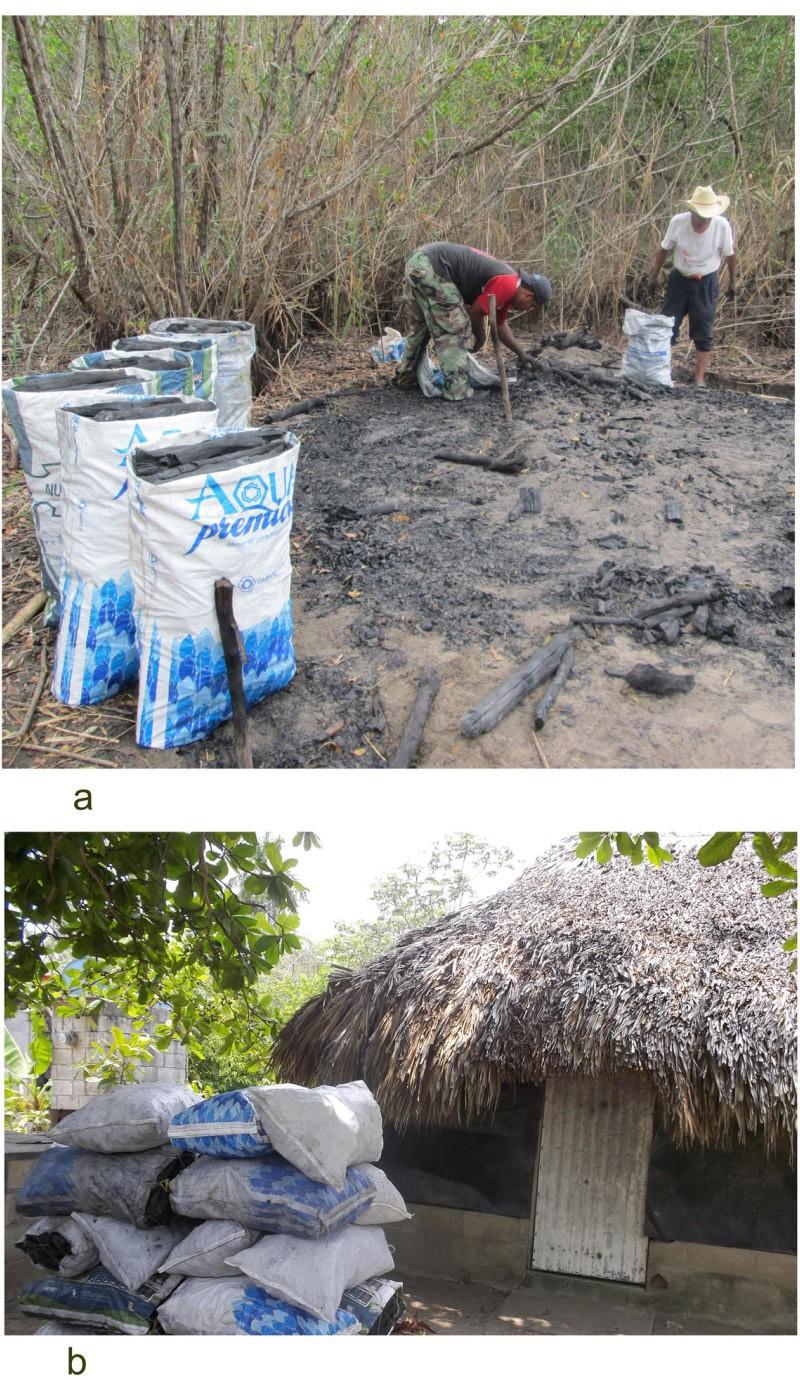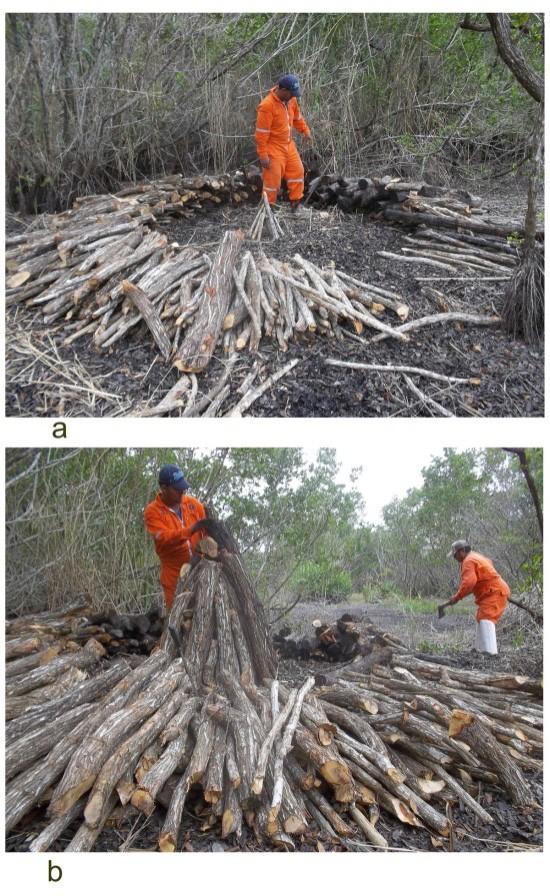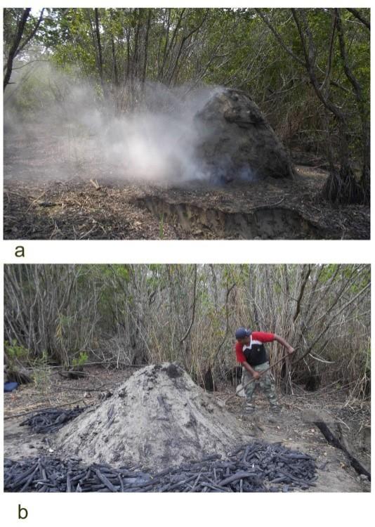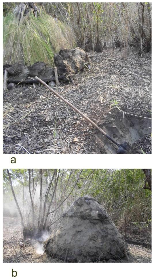 Figura 7. a. Fase de quema; b. Desguarre para la obtención del carbón.