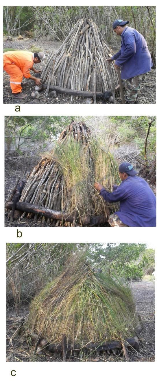 Posteriormente, viene la fase del pajonea- do, que consiste en cubrir el horno con pa- jón o zacate, para evitar que la tierra con la se cubrirá después, se vierta por los pe- queños espacios vacíos entre los troncos (figura 5b). El pasto se consigue cerca de la costa de la playa, encontrando la línea costera a 950 m del área de la carbonera, y se corta con días de anticipación. El tiem- po que se requiere para colocar la paja es de 15 a 20 minutos si lo realizan dos per- sonas. Una vez que se concluyó de cubrir el horno con el zacate (figura 5c), se con- tinúa con la cubierta de tierra. También se puede usar hoja de guano, pero requiere mayor esfuerzo.